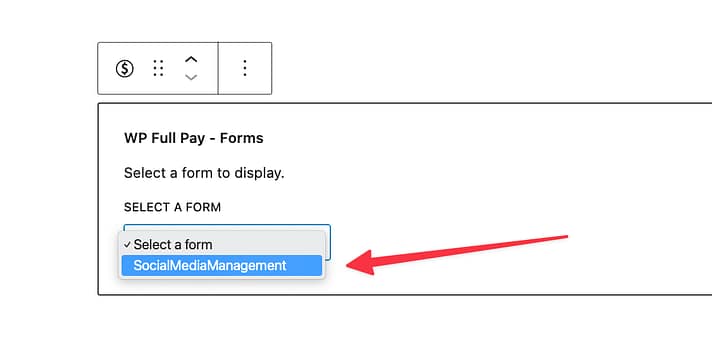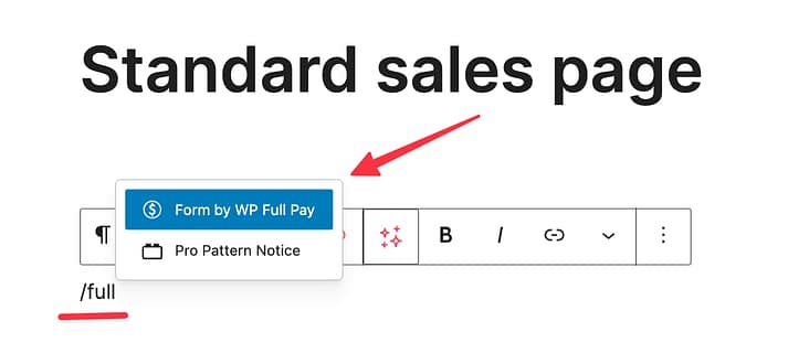 在页面编辑屏幕上,将光标放在新行中,然后开始键入 。这将向您显示区块选择模块,您可以在其中选择一个名为“Form by WP Full Pay”的区块。这样:/full