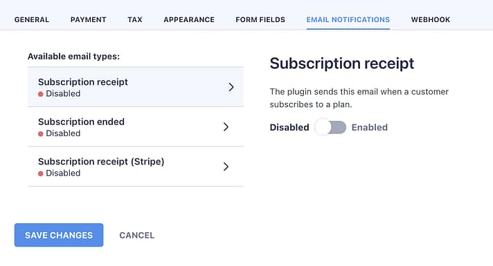 - 基本上,您可以发送两种类型的通知:插件本身发送的通知(列表中的前两个)和 Stripe 发送的通知(最后一个)。