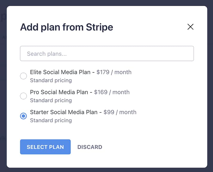 您要做的主要事情是选择要通过此表格销售的经常性产品。这就是您几分钟前设置的 Stripe 产品派上用场的地方。