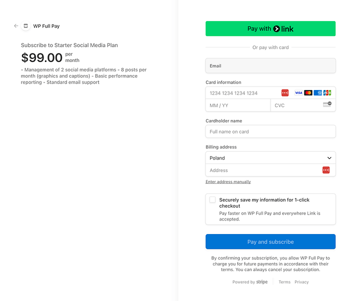 就是这样!现在,您的 WordPress 网站上有一个功能齐全的定期付款表格,由 WP Full Pay 和 Stripe 提供支持。