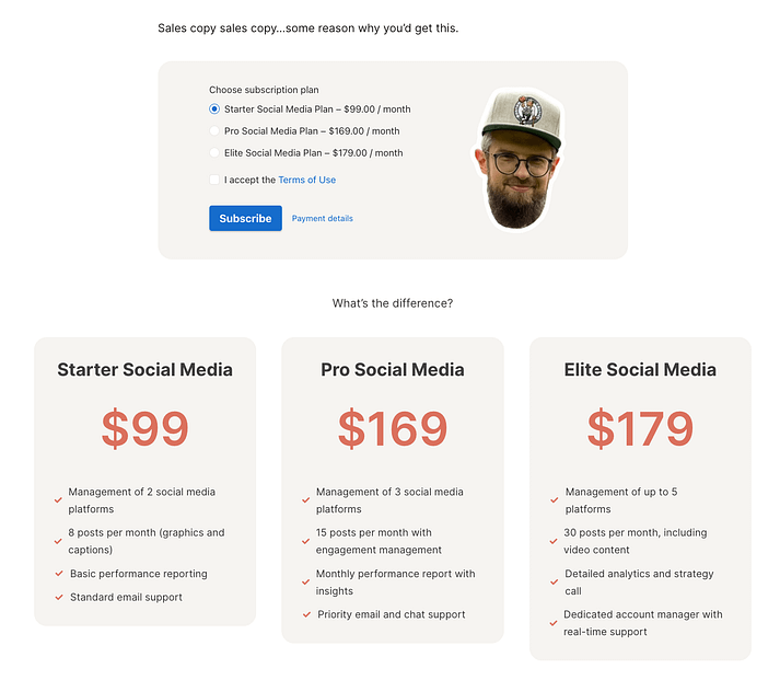 例如,只需几分钟的工作,再加上来自我们的插件 Otter Blocks 的模板定价表,我就构建了这样的页面: