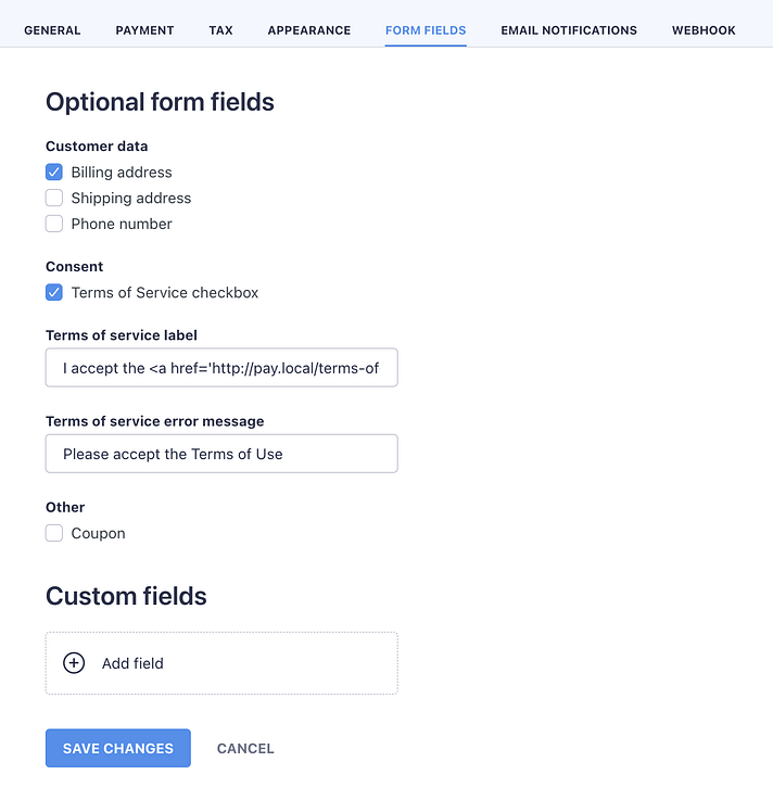 您可以在此处添加额外的表单字段,例如客户的账单地址、同意/协议等。在大多数情况下,您会希望用户在向他们出售订阅之前接受您的使用条款(而不是法律建议)。设置中的此选项卡允许您执行此作。此外,如果您愿意,您还可以在此处添加任意数量的自定义字段。