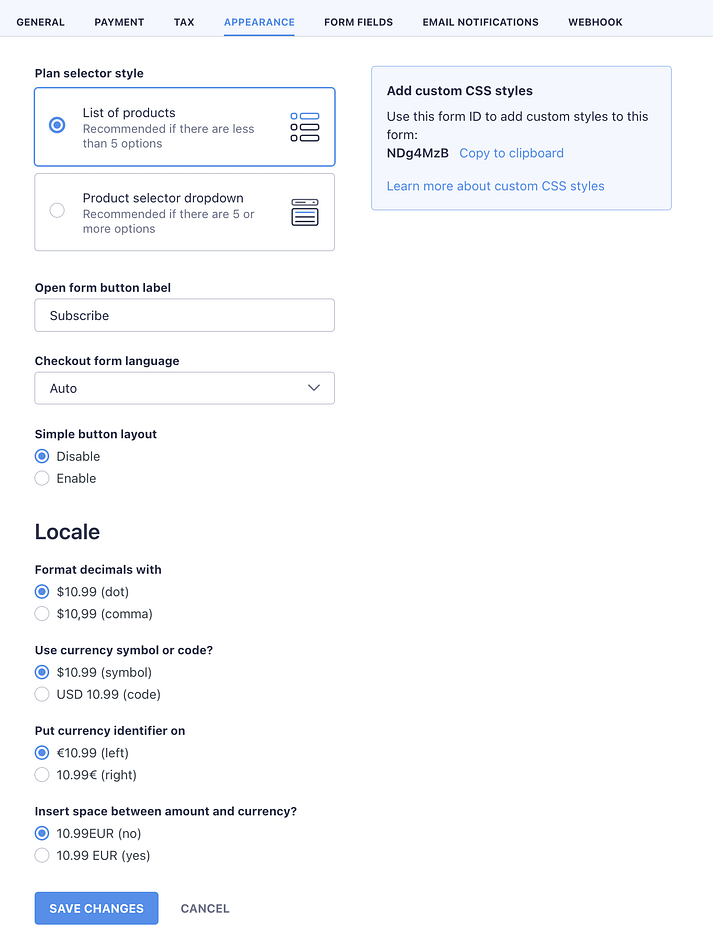 您创建的每个表单都附带了您可以自定义的各种设置。您可以从显示名称等简单选项开始,然后调整付款首选项、税费和其他详细信息以满足您的需求: